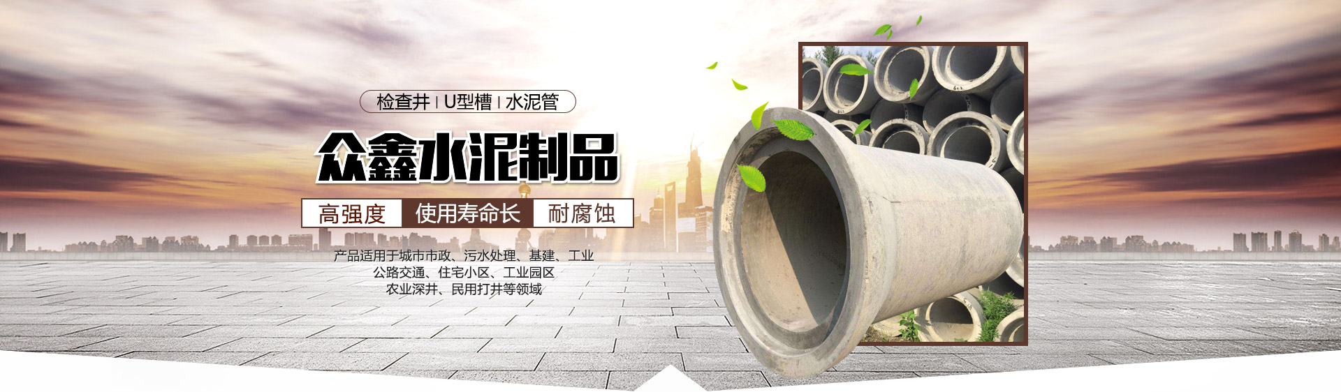 吉林眾鑫水泥制品有限公司,位于吉林省吉林市龍?zhí)秴^(qū)江北鄉(xiāng)官地村,交通便利,廠區(qū)占地面積2萬余平,公司秉承客戶至上,信譽為首,以人為本,安全為先為經營理念,其主要生產各種規(guī)格的平口和承插口鋼筋混凝土排水水泥管,水泥預制檢查井、u型槽等水泥制品。適用于城市市政、污水處理、基建、公路交通、住宅小區(qū)、工業(yè)園區(qū)、工業(yè)、農業(yè)深井、民用打井等領域。